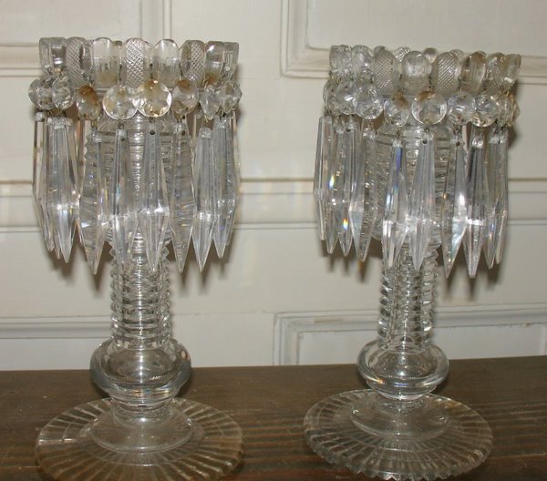 SoldPr Antique Bohemian Crystal LustresPair Antique Bohemian Crystal mantle Lustres. A pair of 19th C. bohemian glass mantle ornaments in blown and cut crystal with large drop crystals 12 3/4" tall . [1] CONDITION: Fine.See Sold Price