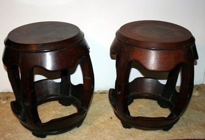SoldChinese hardwood barrel stool and tableChinese hardwood barrel stool and table, 20th c., largest: 18"h x 15" dia, smallest: 11"h x 15"dia.See Sold Price