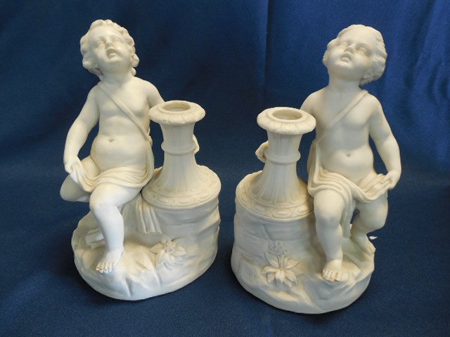 SoldPR CAPODIMONTE FIGURAL CANDLESTICKSPair of 19th c. Capodimonte Italian Porcelain Candlesticks, each with wide bobeches and two putti mid-stem, brightly painted and with gilded highlights, blue crowned N mark on base, 11" high, 5 1/2" dSee Sold Price