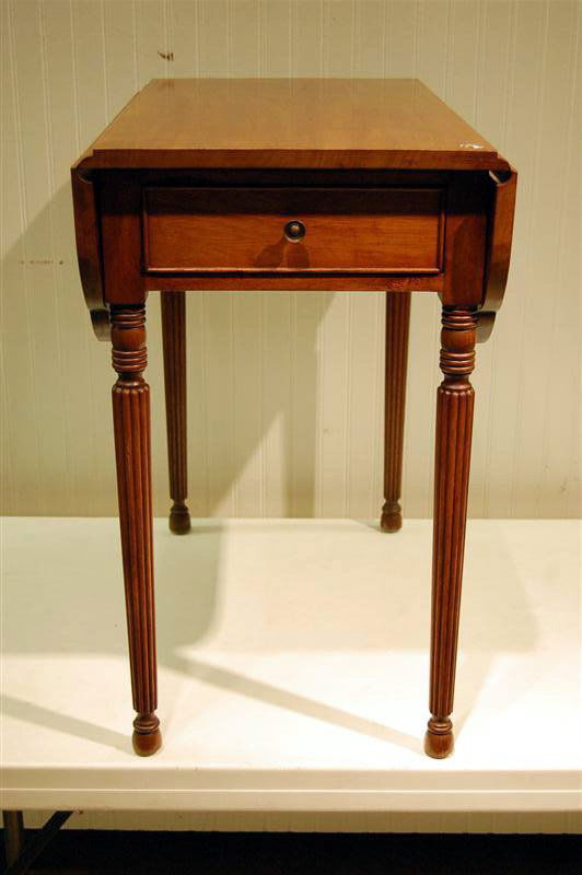SoldKindel Mahogany Pembroke Tables H 28'' W 21'' Depth 32'' 1 PairKindel Mahogany Pembroke Tables H 28'' W 21'' Depth 32'' 1 Pair Drop shaped leaves depth 11.5". Single drawers. For Christman's Winterthur Collection.See Sold Price