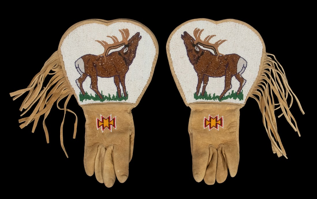 SoldNative American Nez Perce Beaded Gauntlets (pr)**Originally Listed At $300** Native American, United States, Columbia River Plateau region, Nez Perce, ca. early to mid-20th century CE. A pair of hand beaded gauntlet style gloves made from brain-taSee Sold Price