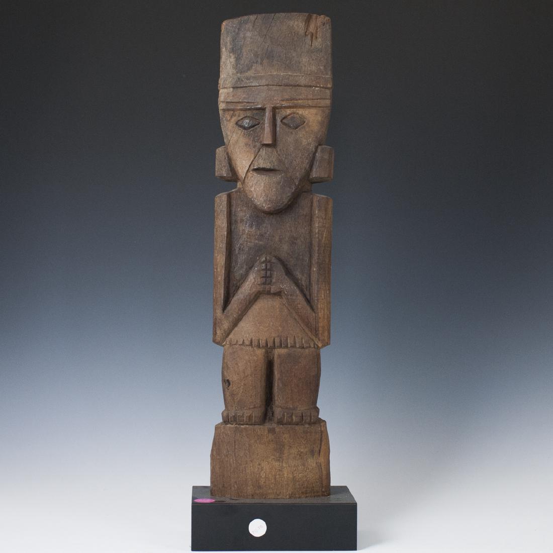 SoldChimu Wood Standing Idol FigurePre-Columbian, Peru, Chimu, ca. 900 to 1470 CE. A hand carved wooden standing idol figure with arms positioned over chest and hands pressed together in a prayerful gesture. The head and body are charaSee Sold Price