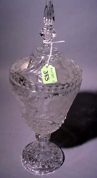 PRESSED GLASS COVERED COMPOTE ON CIRCULAR PEDESTAL