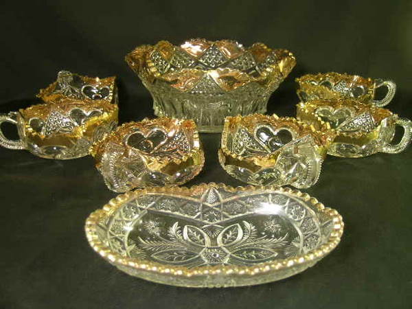 PRESSED PATTERN GLASS DECORATED BOWL GROUP 7pcs