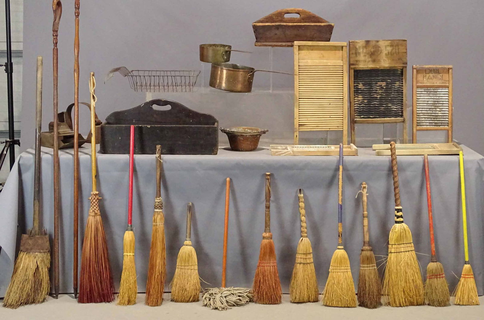 SoldPrimitive LotLarge collection of antique and vintage kitchen primitives including rug beaters, enamelware, trivets, tinware, Wagnerware, iron coffee pot, tin spice set, utensils, washboard, treenware etc.. Approx.See Sold Price