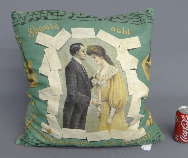 SoldFRAMED VICTORIAN "TARGET HEART" FENCING LADY PRINTED PILLOW COVER.A wonderful depiction of a Victorian fencing lady labeled "Target Heart", printed on a pillow cover in textile. No discernible issues or distraction, a great piece with a very early look. Condition: (See Sold Price