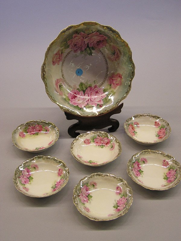SoldBerry Set Marked R.S. Prussia, Carnation MoldBerry Set Marked R.S. Prussia, Carnation Mold, Incredible Tiffany, White And Lavender Satin, Pink And Yellow Rose Decor, Nice Gold Trim Highlights, (1) 12" Master Bowl, (6) Matching 5.5" Berry Dishes,See Sold Price