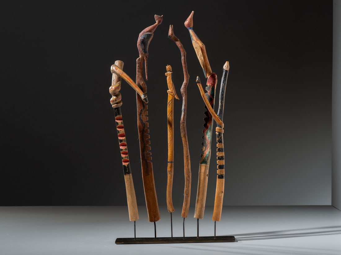 SoldFour Yoruba or Benin figural dance/parade sticks two with standsFour Yoruba or Benin figural dance/parade sticks two with stands, Nigeria, first half 20th century, greatest 40"h (overall). Provenance: Collection of Vanna and N. Lee Lacy (Palm Springs, California)See Sold Price
