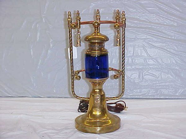 SoldLOT OF 3: RAILROAD LAMPS.(A) Oil burning brass wall lamp with a hurricane globe and a milk glass shade, made by the Adams & Westlake Co. Very good condition. (B) Small bell-shaped heavy brass lamp with "Pullman" embossed in aSee Sold Price