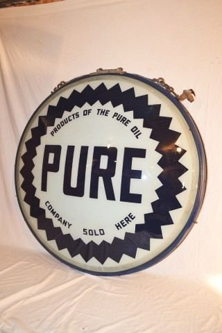SoldSET OF 2: PRODUCTS OF THE PURE OIL COMPANY 15" GLOBE LENSES W/ SAWTOOTH BORDER.Set of Two 15" Globe Lenses. A nice matching set of 15" Globe Lenses for Pure Oil Company showing bold Pure script with blue & white colors. A product of The Pure Oil Company, Chicago, Illinois. CONDISee Sold Price