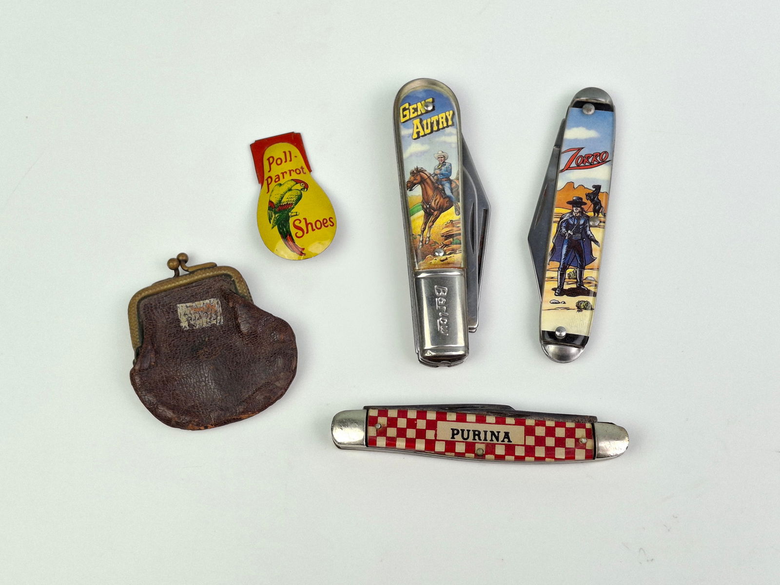 COLLECTIBLES- GENE AUTRY POCKET KNIFE, ZORO POCKET KNIFE, PURINA ADVERTISING FOLDING KNIFE, POLI-PAR