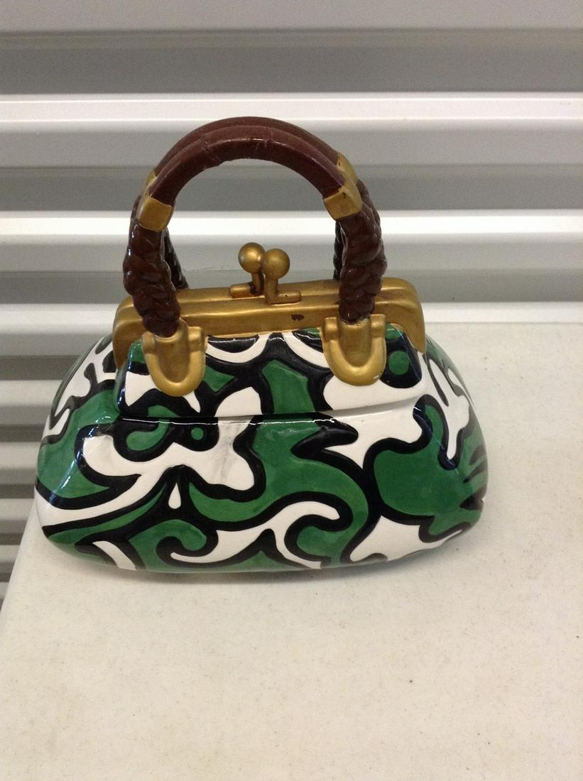 SoldCeramic Purse Motif Cookie JarCeramic Purse Motif Cookie Jar, underside reads Davids Cookies, measures 6 1/2 in long x 4 1/2 in wide, 7 in tall, small chip to purse zipper logo. Kitchenware, kitchenalia, kitchen decor, cookie jar,See Sold Price
