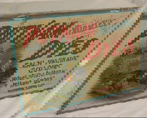 SoldAntique Store Display, Putnam Dye BoxThis is a great antique Putnam Dye Box. Top of the box is an enamel sign with rounded metal push pins holding it into the box. Box has metal hinges open front door flap which reveals a Putnam Paper laSee Sold Price