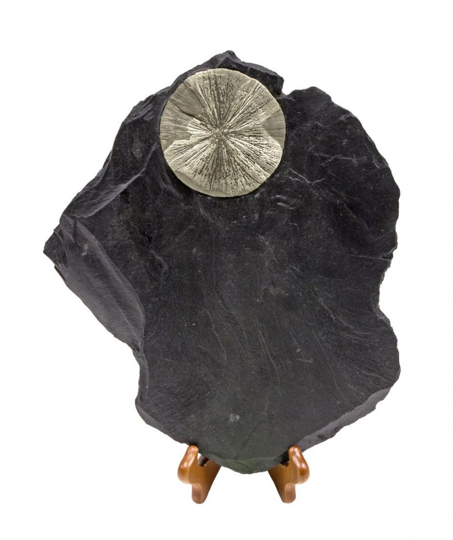 SoldPyrite "Soleil" Sun and Slate Fossil Rock SculptureAn unusual mineral display, with a pyrite or fool's gold formation set in a slate matrix. 8.25" x 11" Condition vg/gSee Sold Price