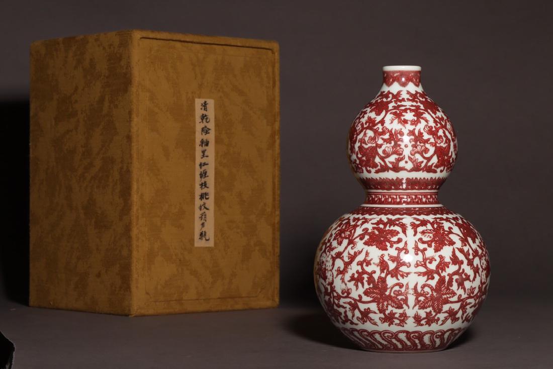 SoldChinese Blue-White Copper Red Bottle Vase QianLong MarkChinese Blue-White Copper Red Bottle Vase QianLong Mark 13-7/8'' H; 9-3/4'' W; 7.8 lb Shipping: We are able to pack and ship this item to an address in the United States via UPS Ground or USPS PrioritSee Sold Price