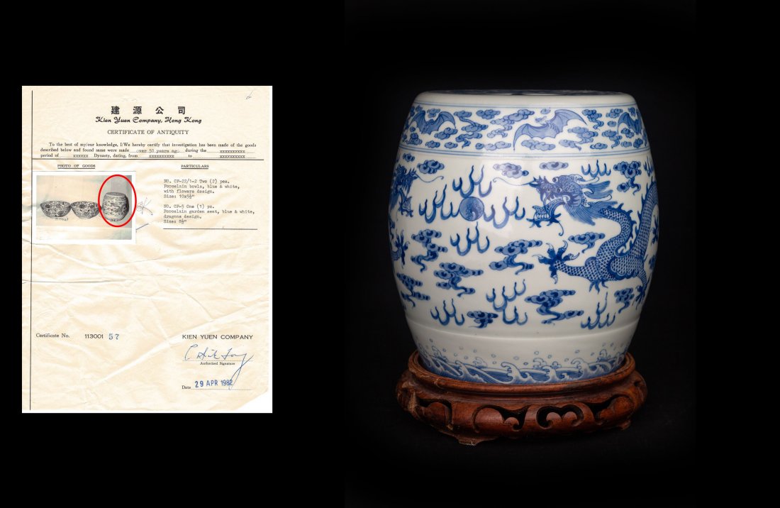 QING BLUE WHITE FIVE-FINGER DRAGON STOOL CERTIFICATE