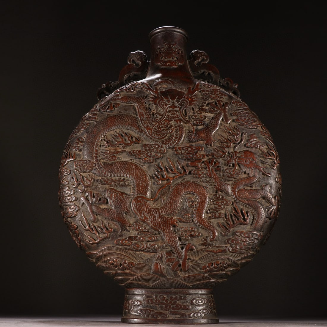 QING DYNASTY AGARWOOD DRAGON-PATTERNED FLAT BOTTLE