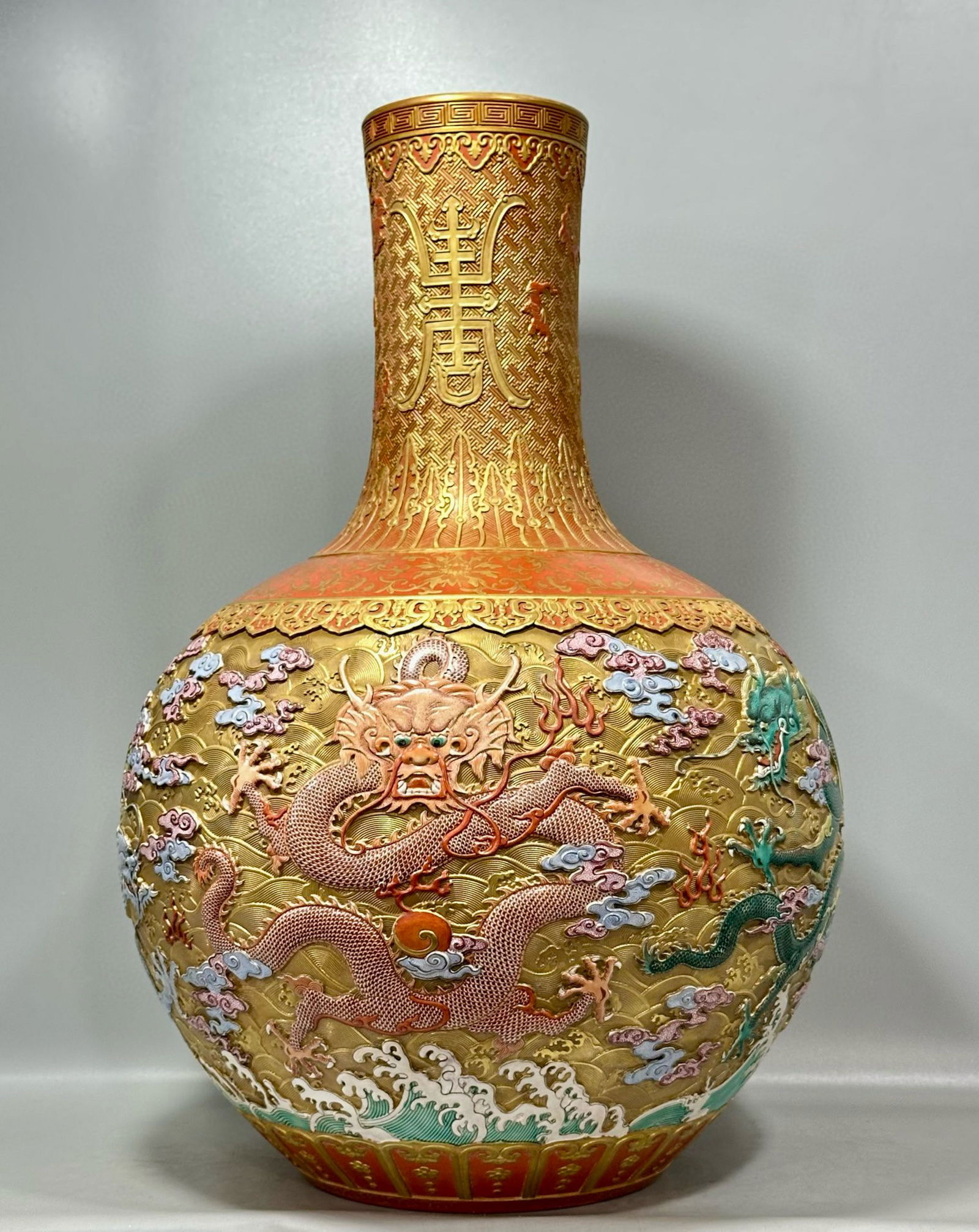 QING DYNASTY - ENAMEL CARVED DRAGON PATTERNED CELESTIAL SPHERE VASE