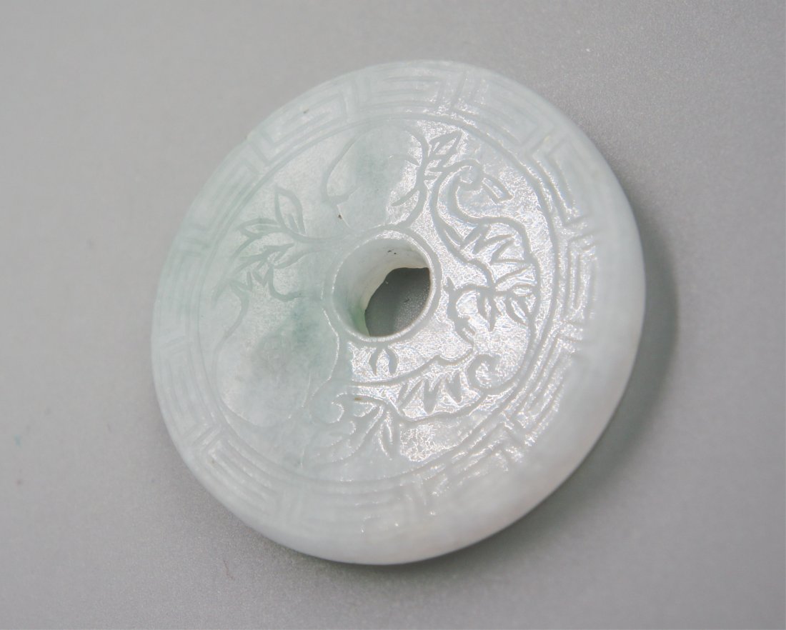 Antique Qing Dynasty Carve Jadeite Bi PendantAntique Qing Dynasty Carve Jadeite Bi Pendant, diameter of pendant: 2.25", total length 24.5"See Sold Price