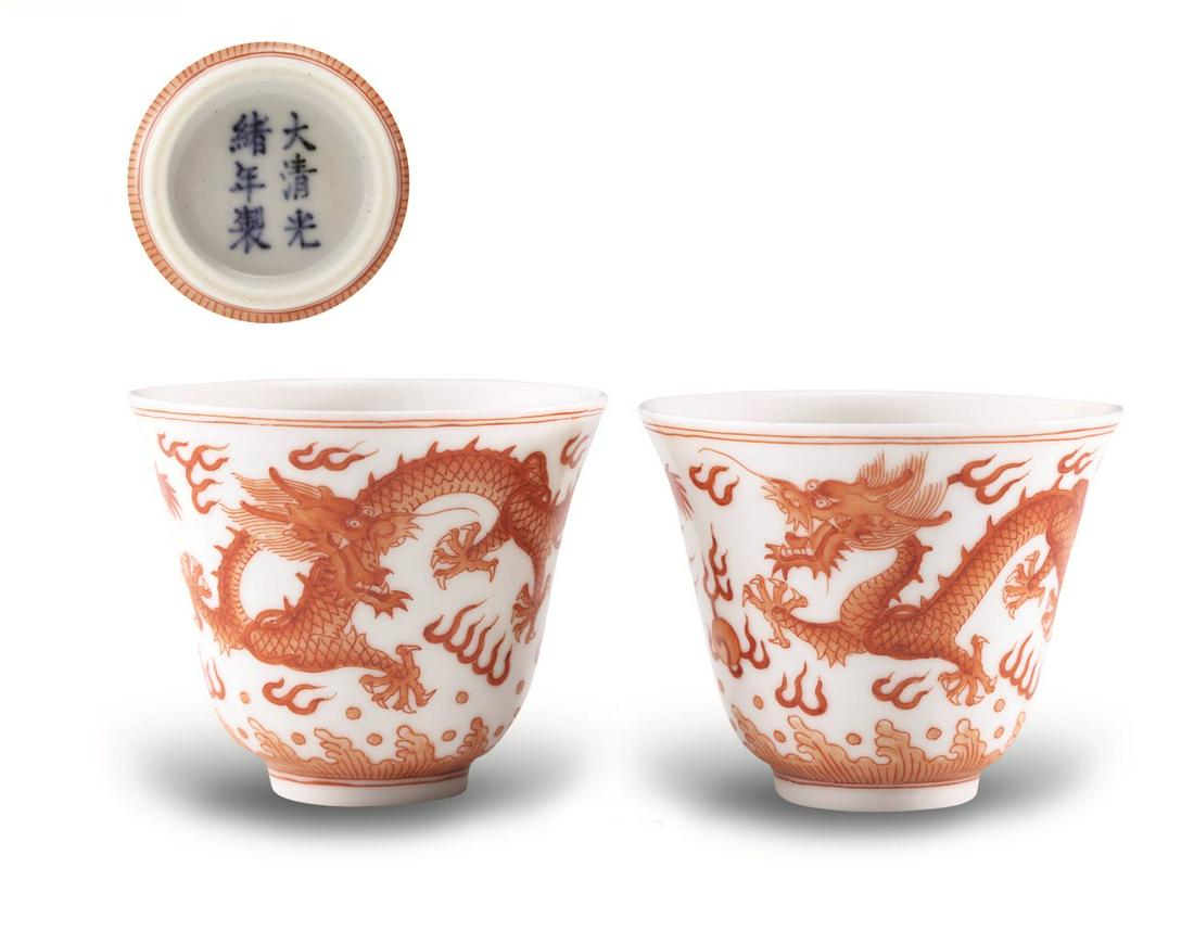 A Pair of Iron-red Cups with Seawater, Clouds and Dragon