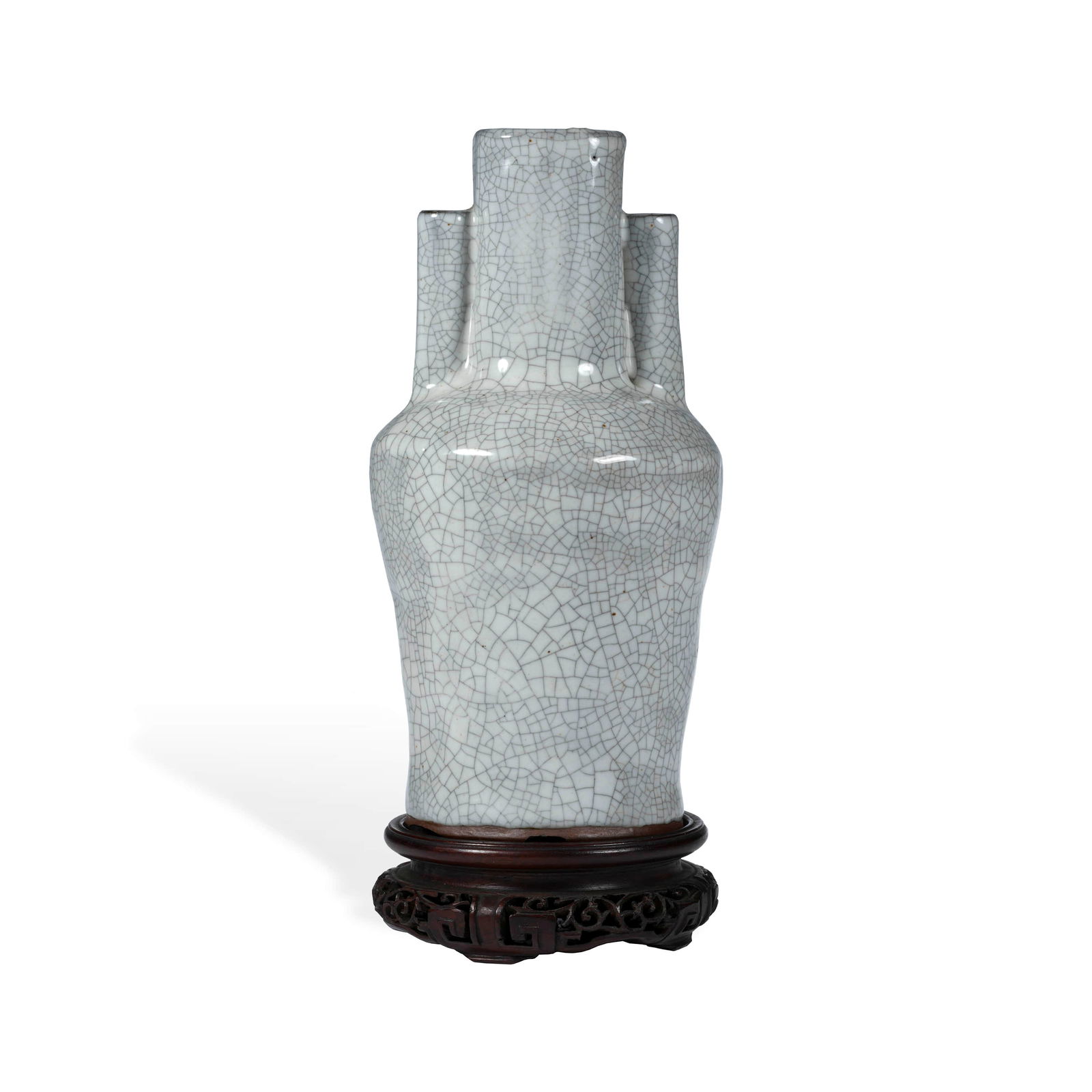 SoldChinese Qing "Ge" ware glaze porcelain vase,Chinese Qing "Ge" ware glaze porcelain vase, flanked by handles and raised on a rosewood stand. PROVENANCE: From the Collection of Wei Yuan Hsueh and Emily Hsueh, Dallas, Texas. Owners of the former OSee Sold Price