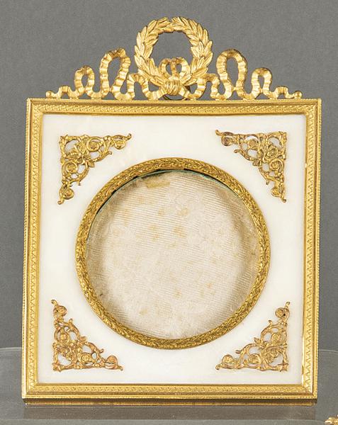 SoldA small bronze picture frame with 'Guilloche enamel', gilt bronze. With a Limoges enamel plaque.A small bronze picture frame with Guilloche enamel, gilt bronze. Decorated with garlands and flowers in Louis XVI style. Enamel plaque signed 'After Albert DE MANDRE (1869-?)'. The plaque wasSee Sold Price