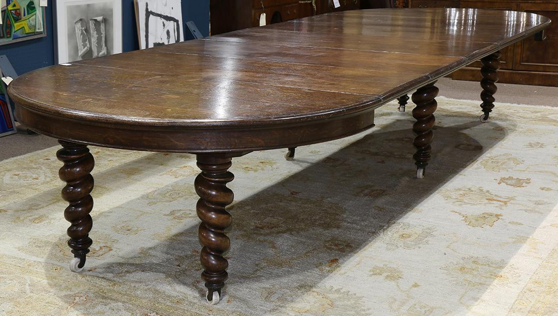 SoldVictorian oak dining table, center pillar & lion legs,Victorian quarter sawn oak dining table, with carved center pillar & lion legs, 2 lvs, beautiful base under a nicely grained table top, finish is nice, table can extend beyond the 2 leaves we have. ISee Sold Price