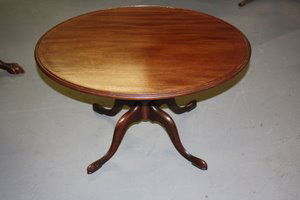 SoldFurniture: Queen Anne style Round Tilt Top Side TableAntique mahogany side table with 18 ½” diameter wood top over pedestal base raised on tripodal legs, overall 29 ¾” tall.See Sold Price