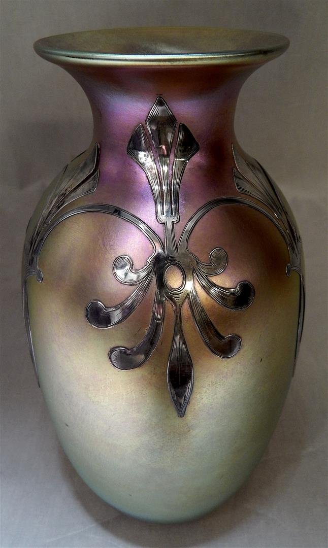 Quezal Vase with Alvin Silver Overlay