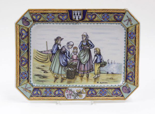 SoldFrench Faience Quimper Wedding Platter by De La Hubaudi?¨reA stunning decorative platter, marked with HB Quimper monogram on underside, late 19th century circa. Portraying a wedding scene, featuring a heavily decorated arabesque rims, with the coat of aSee Sold Price