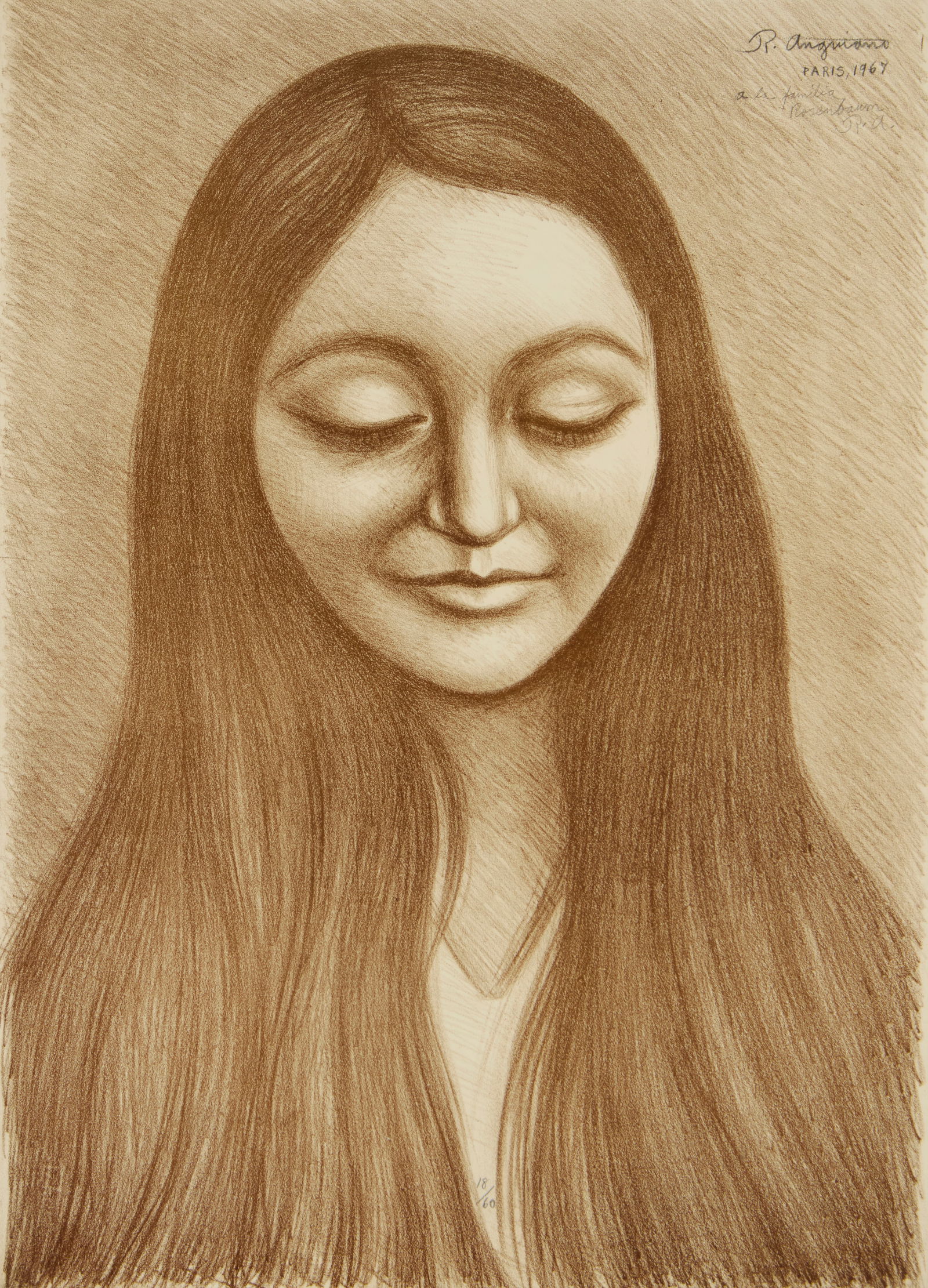 SoldRaul Anguiano(Mexican, 1915-2006) Young Girl, signed upper right "R. Anguiano/1964", black and sanguine crayon on paper, 28 x 22 in.; gilt wood frame,. Condition: not removed from frame, light toning. Provenance:See Sold Price
