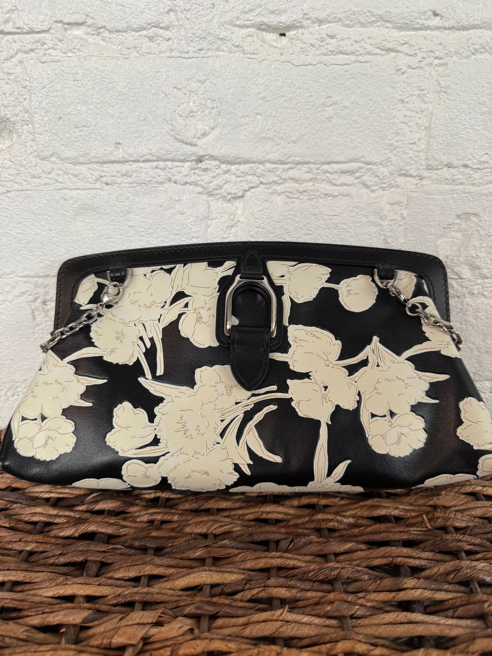 SoldRalph Lauren Leather Crossbody & Handbag 2pc LOTLot of two black leather bags by Ralph Lauren. The first is a structured crossbody bag from the Ralph Lauren Collection, featuring a bold gold-tone RL logo on the front flap and a matching leather hanSee Sold Price