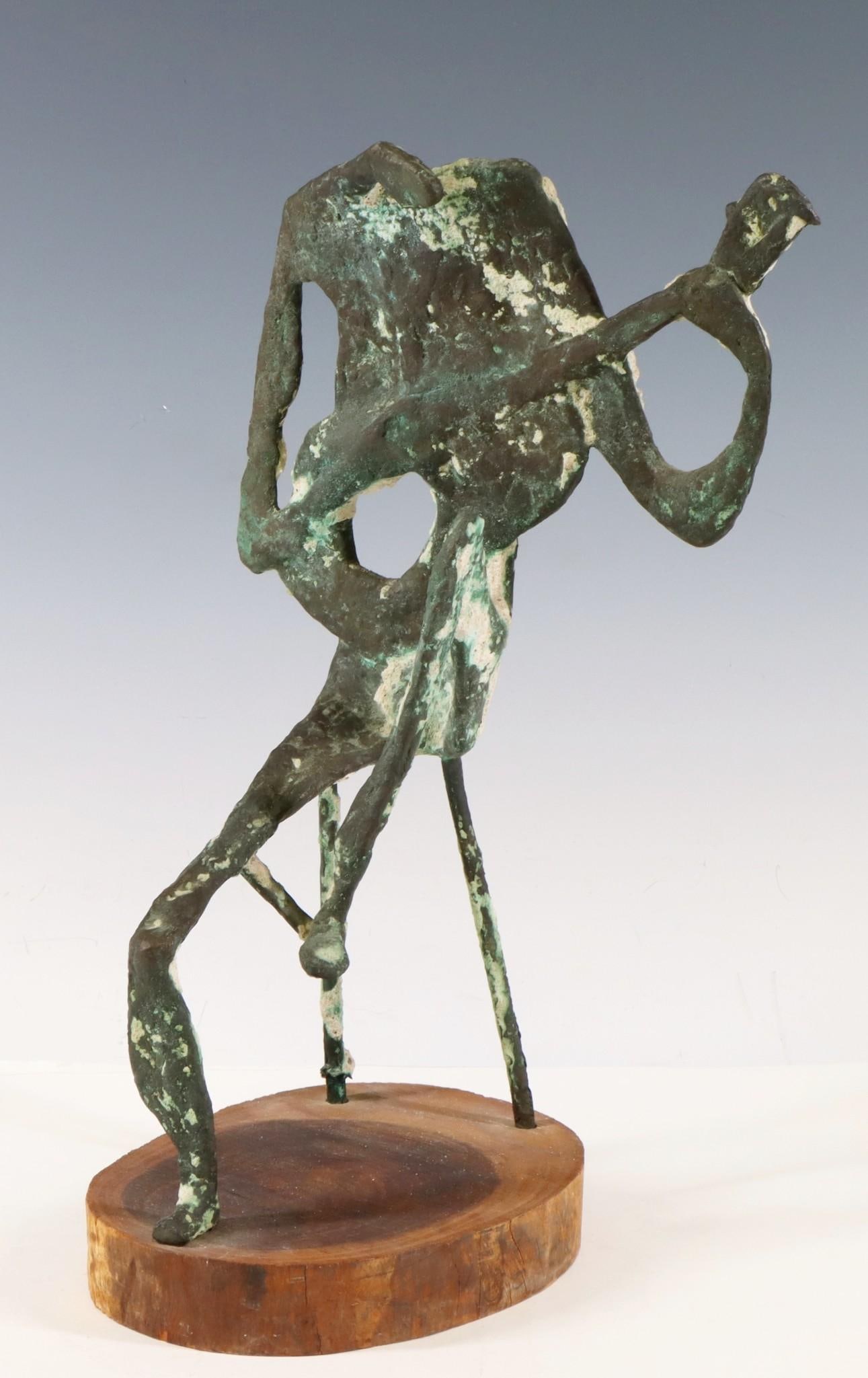 SoldRamon Lapayese (1928 - 1994)Spanish figurative expressionist sculpture, depicting a seated guitarist, bronze mounted to a wood slab base. Impressed signature en verso, with a gallery tag for Galerie Norval, Paris, and French expSee Sold Price