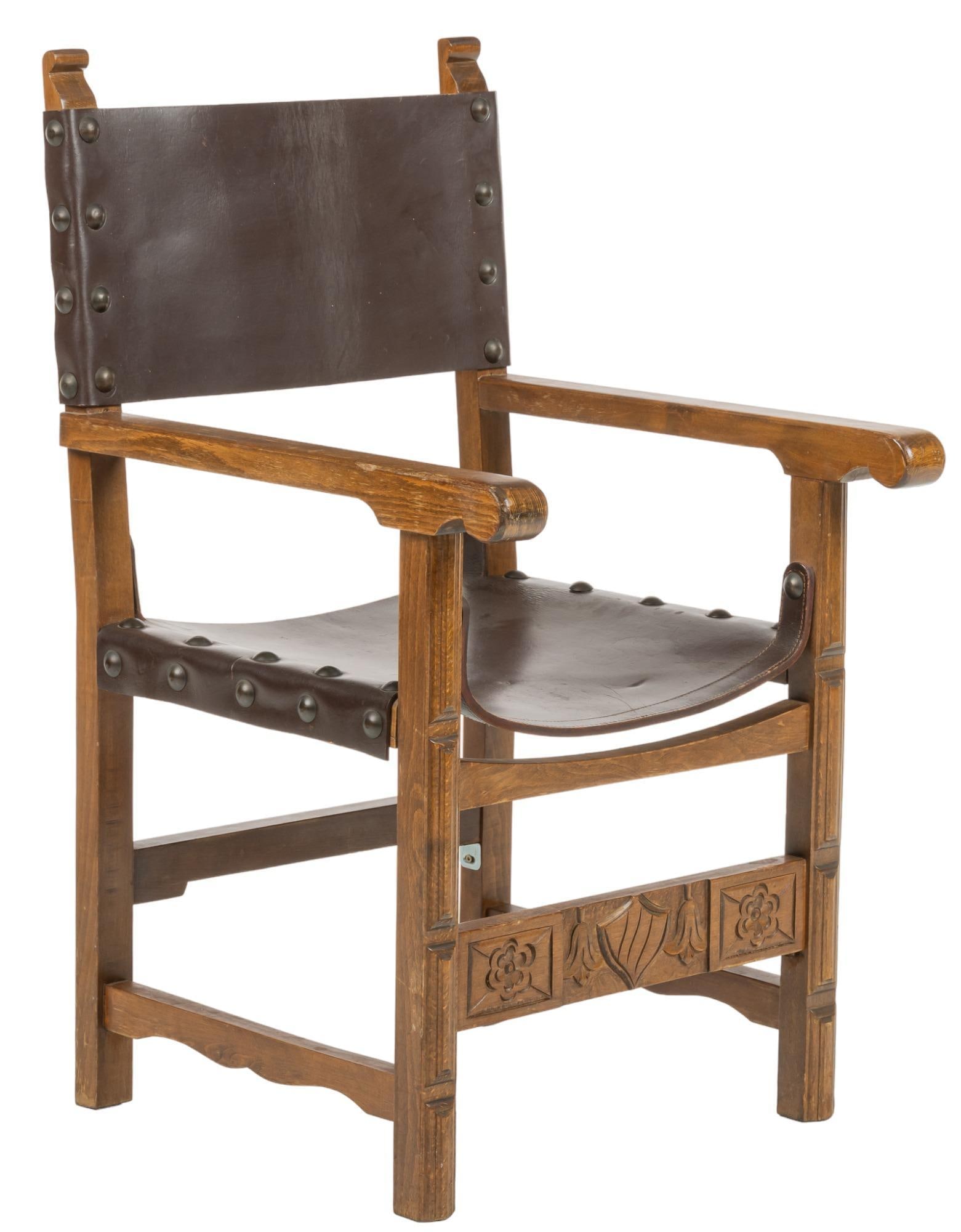 SoldRanch-Style Cowhide ArmchairRanch style armchair, having heavily carved classical frame, featuring caryatids, arched crest, rawhide lined back, leather upholstered set, rising on stretchered carved legs ending in paw feet 59.5"See Sold Price