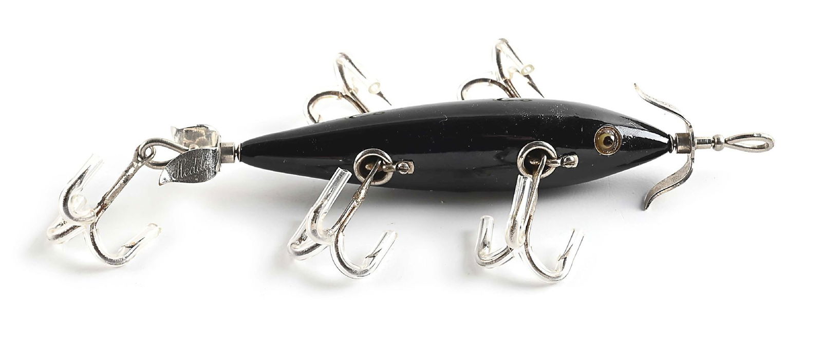 SoldHeddon Black Sucker Musky MinnowRare 1300 cup rigged model with a marked front spinner and large glass eyes. Grading about VG+ with hairlines in one eye, a few tiny chips/touchups, age lines, small areas of varnish flaking, the bellSee Sold Price