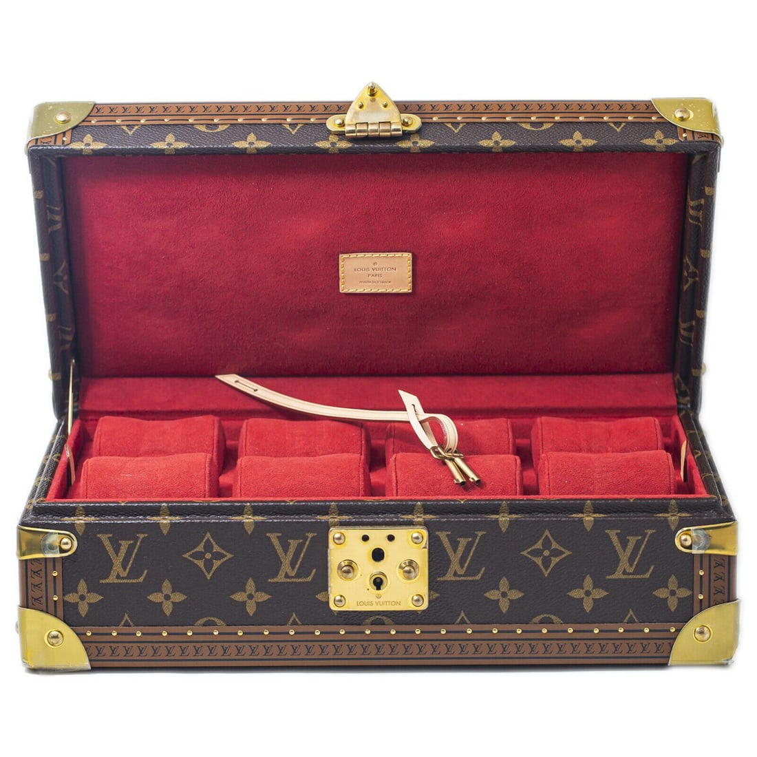 SoldLOUIS VUITTON MONOGRAM CASES, 1980s-20201 Monte Carlo Jewelry Case w/ lock & 2 keys, no manufacturer’s code found, label "Louis Vuitton Paris Made in France", 8" x 5" x 2", (zip pull separation, minor tarnish, minor scuffing to interSee Sold Price