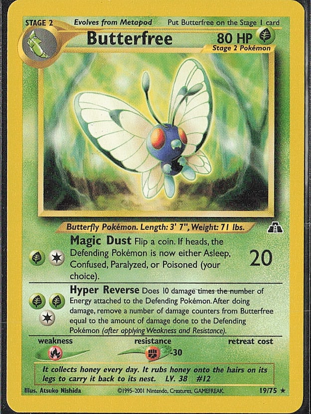 Butterfree SV: Scarlet & Violet 151 #012/165 Pokemon CardMar 29, 2026Pineco Neo Discovery #61/75 1st. ED. Pokemon CardMar 29, 2026Yanma (36) Neo Discovery #36/75 Holo Pokemon CardMar 29, 2026Koga's Beedrill Gym Challenge #009/132 Holo Pokemon CardMar 29, 2026Jumpluff Neo Genesis #007/111 Holo Pokemon CardMar 29, 2026Venomoth Pokemon Jungle # Holo Pokemon CardMar 29, 2026Dark Golbat (7) Team Rocket #07/82 Holo Pokemon CardMar 29, 2026Mothim POP Series 7 #005/017 Holo Pokemon CardMar 29, 2026M Beedrill EX XY Promos #XY158 Pokemon CardMar 29, 2026Poliwag Neo Discovery #62/75 1st. ED. Pokemon CardMar 29, 2026Nidoking Base Set 2 #011/130 Holo Pokemon CardMar 29, 2026Hoppip Neo Discovery #55/75 1st. ED. Pokemon CardMar 29, 2026Sentret Neo Discovery #63/75 1st. ED. Pokemon CardMar 29, 2026Venusaur Base Set (Shadowless) #015/102 Holo Pokemon CardMar 29, 2026Vibrava SV7a: Paradise Dragona #071/064 Pokemon CardMar 29, 2026Victreebel (14) Jungle #14/64 Holo Pokemon CardMar 29, 2026
