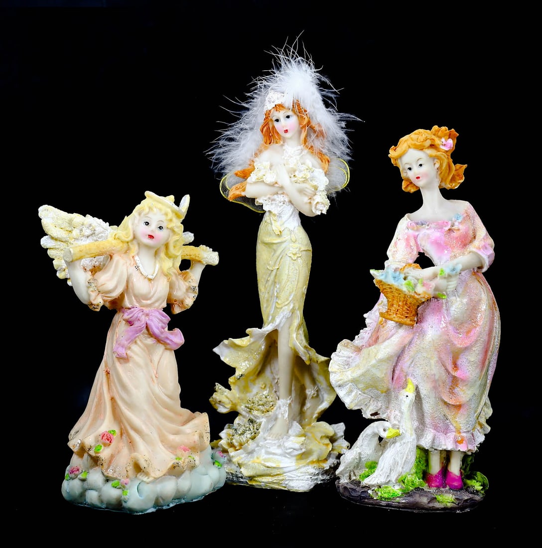 3 Vintage Plaster Flower Fairy Lady with Net Wings Art Sculpture Statues Figurine