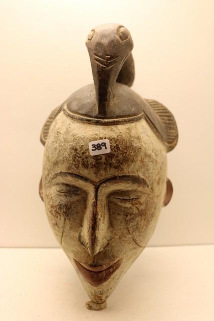 SoldA Fine Old Yaure MaskClassic carved wooden dance mask with a finely rendered human face with raised scar's and and geometric designs, elaborate coiffure and woven grass "cushion" on the back for the dancer. The mask measuSee Sold Price