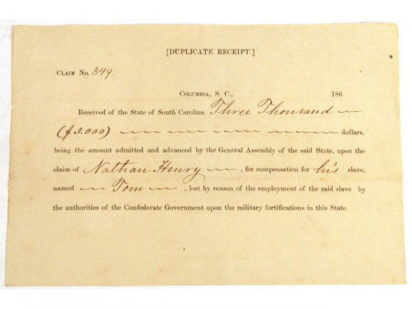 RECEIPT FOR COMPENSATION FOR LOST SLAVE