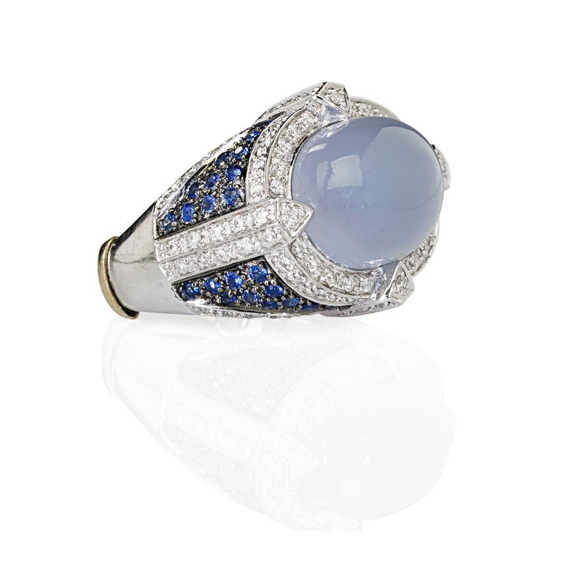 RECENT CHALCEDONY, DIAMOND AND SAPPHIRE RING