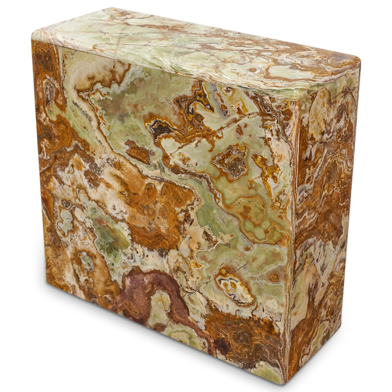 SoldGreen Onyx Stand or Pedestal.The lot consists of a rectangular green onyx pedestal or stand. The hollow stand has a thickness of 3/8". It is reinforced with fiberglass on the inside and protected with a clear material (resin ?) oSee Sold Price