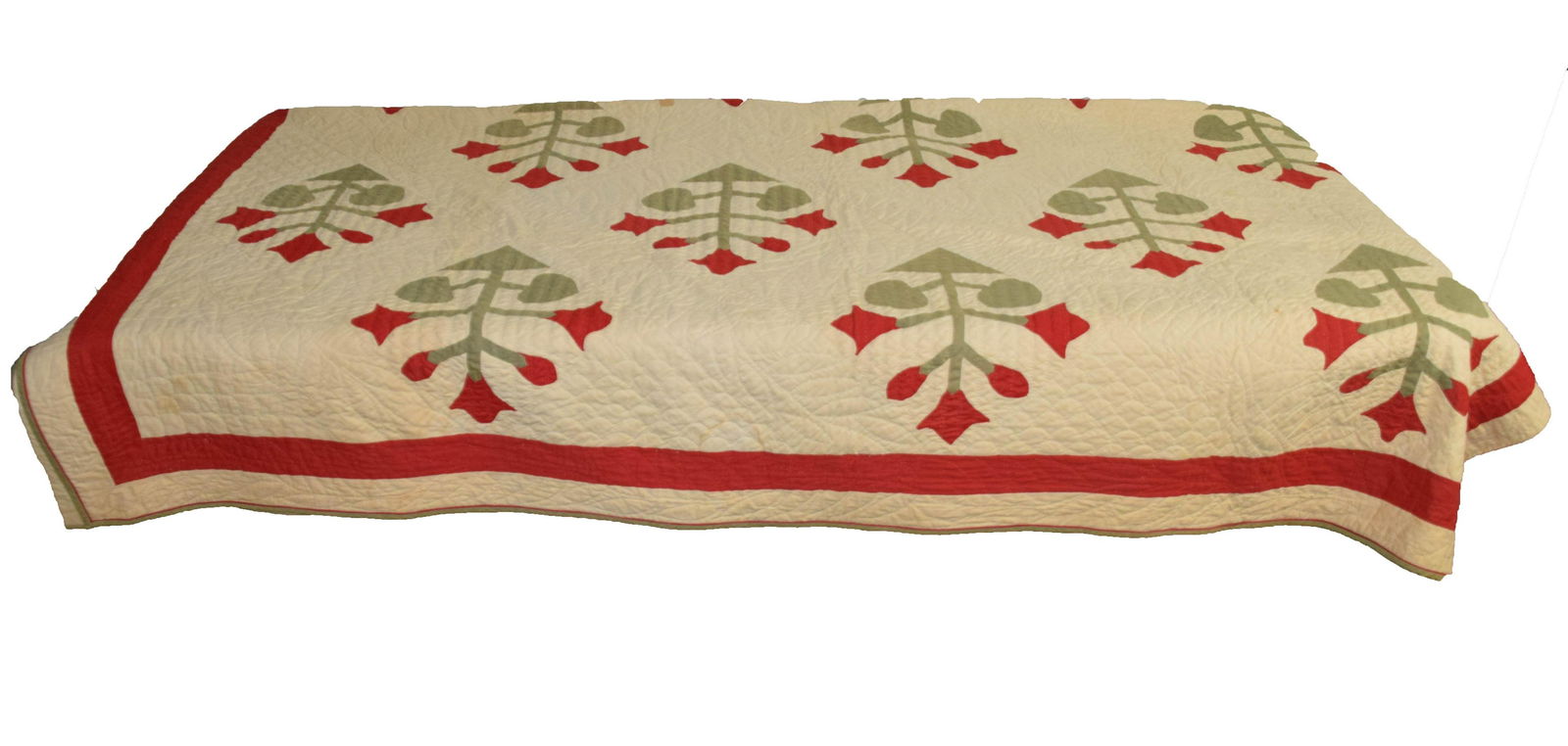 Sold19th C Carolina Lily Red Green Quilt - ExcellentExcellent condition Carolina Lily quilt, large lilies, great stitching / quilting including heart designs, 77 x 78". Excellent condition.See Sold Price