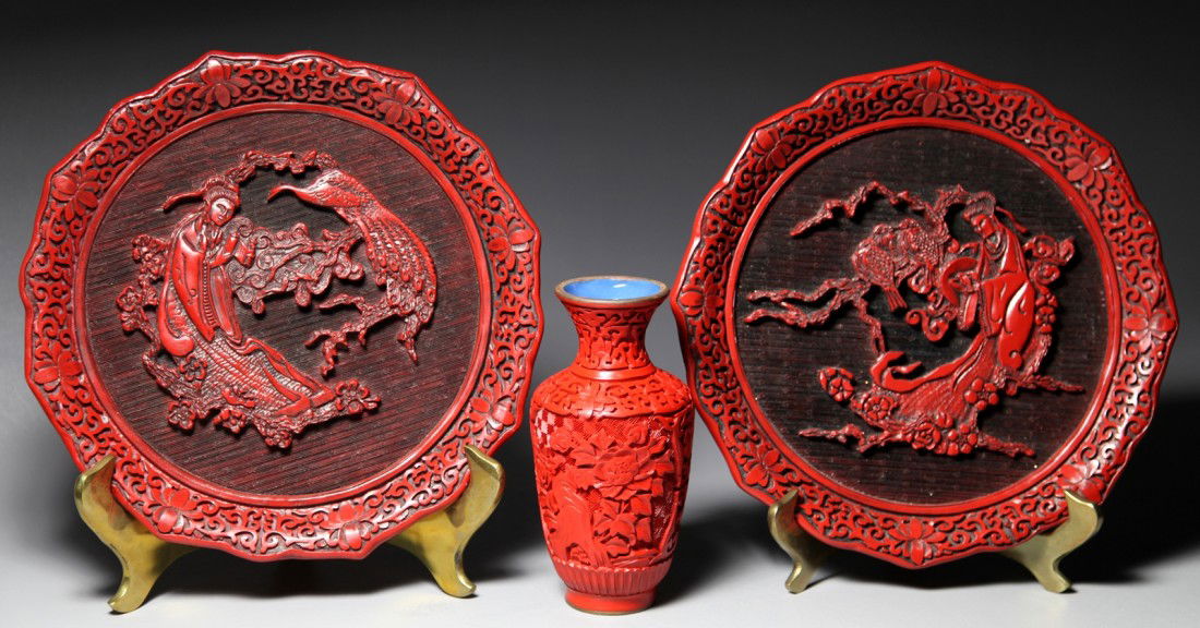 RED CINNABAR VASE AND TWO RED CINNABAR PLATES