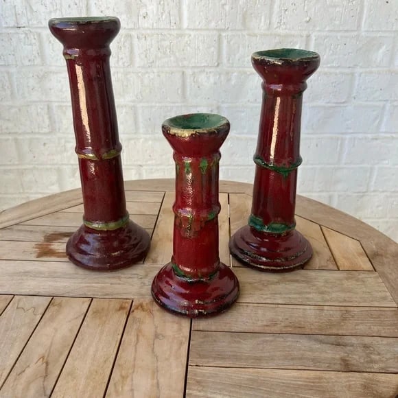 Red Glazed Bamboo Candle Stick Holders