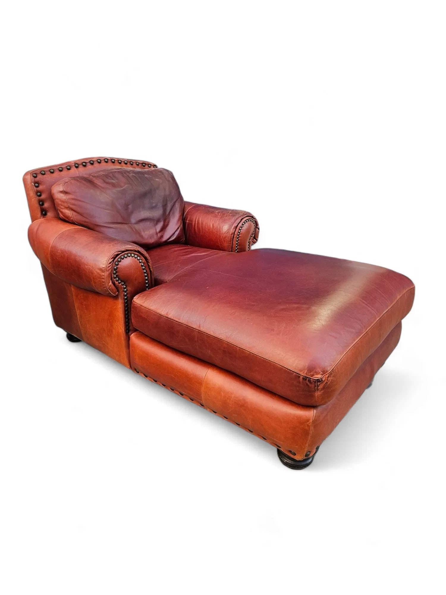 SoldModern Red Leather Chaise LoungeModern Red Leather Chaise Lounge. 28 1/2"h x 74"w x 28 1/2"d.. Condition, minor scratches , scuffs and stainsSee Sold Price