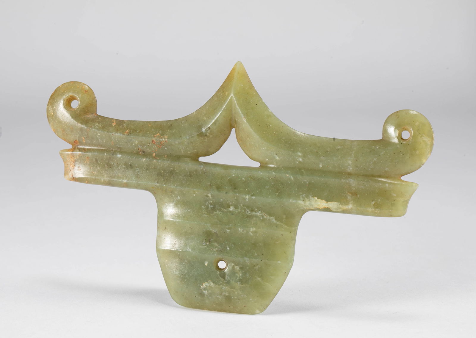 SoldCHINESE GREEN JADE CROWN PENDANTFlared ends with three rings in centre. W. 7.8cm (3 1/8 in.) Provenance: From an old English private collection, acquired from local antique stores and markets in the UK since the 1950’s.See Sold Price