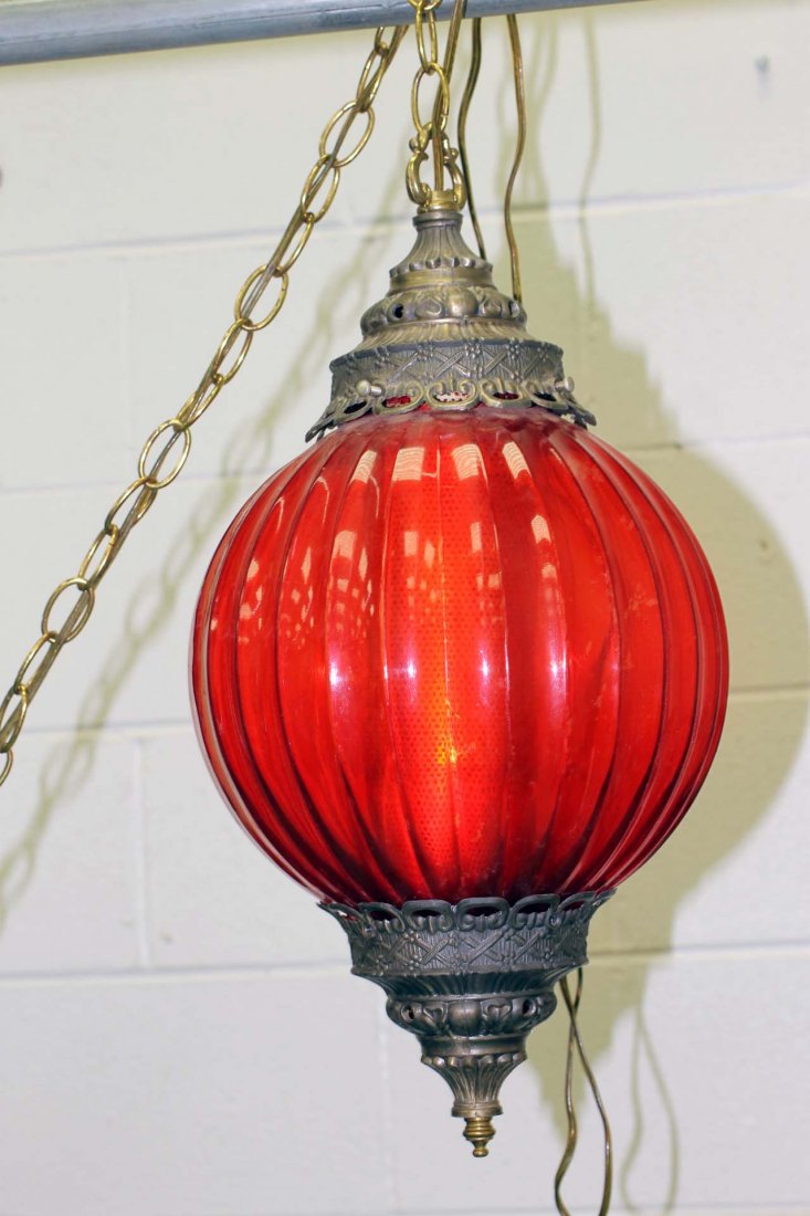 Mid Century Hanging Swag Lamp with Red Colored Glass