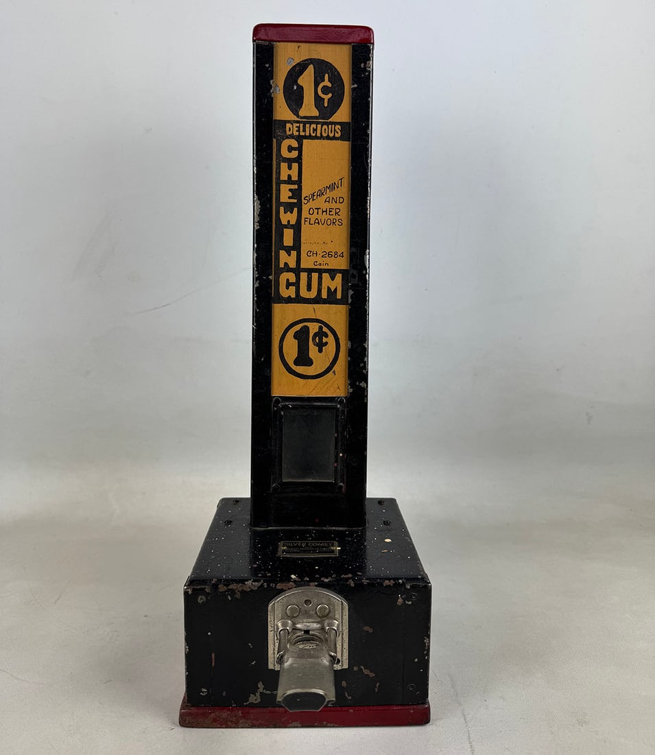 Sold1¢ Redco Silver Comet Gum Vending Machine.Countertop column gum vendor with black textured body and vertical column and window to view product. Released by Redco Products Corp. in 1925. Works nicely. Includes two keys. Condition: (Good - VerySee Sold Price