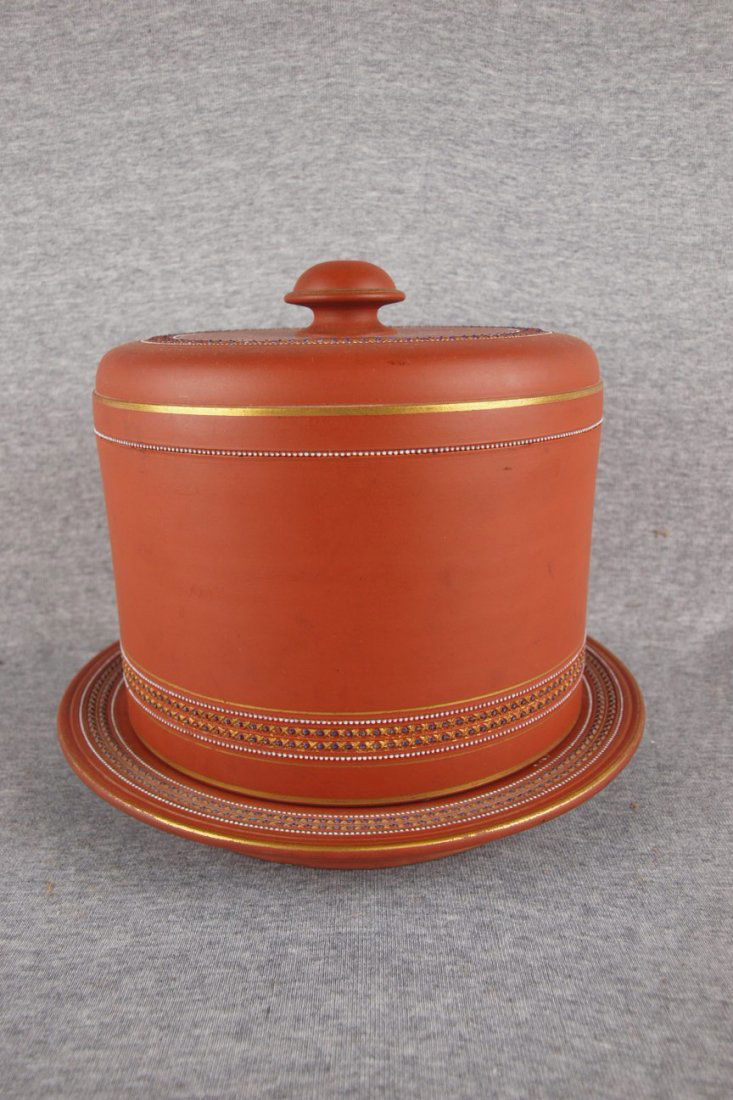 Redware cheese keeper with enamel beading decor, 8 1